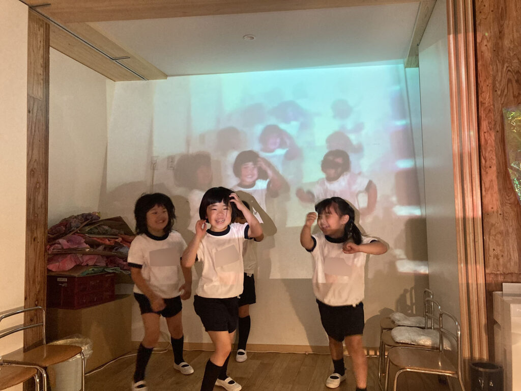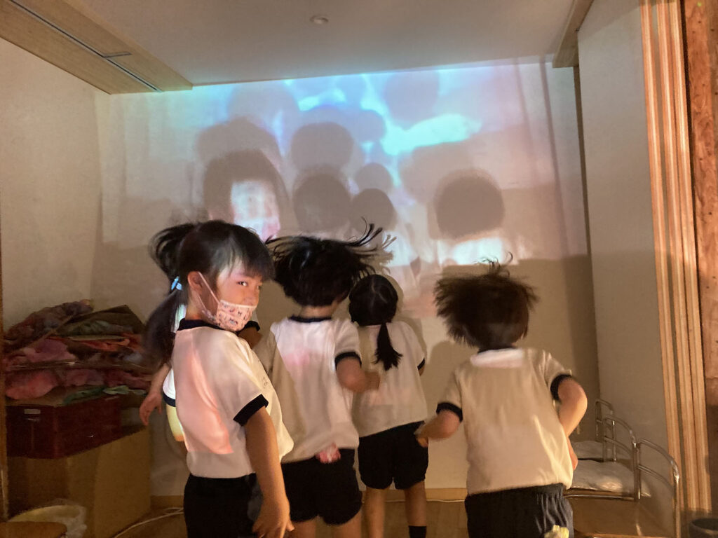 今日はスクリーンの布をしまって、壁に映します。壁に向かって映るみんなの影。それを映そうとカメラを向けると、自分たちがいっぱい映ってる!気づくと大喜びで、きょろきょろ。 ポーズを取ったり、ピシッと立ったり、ジャンプしたり。 カメラマンになりたい子は、順番にカメラをそうっと持ちます。 みんなで「おもしろい」を味わっています。