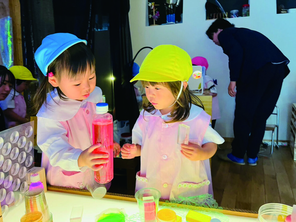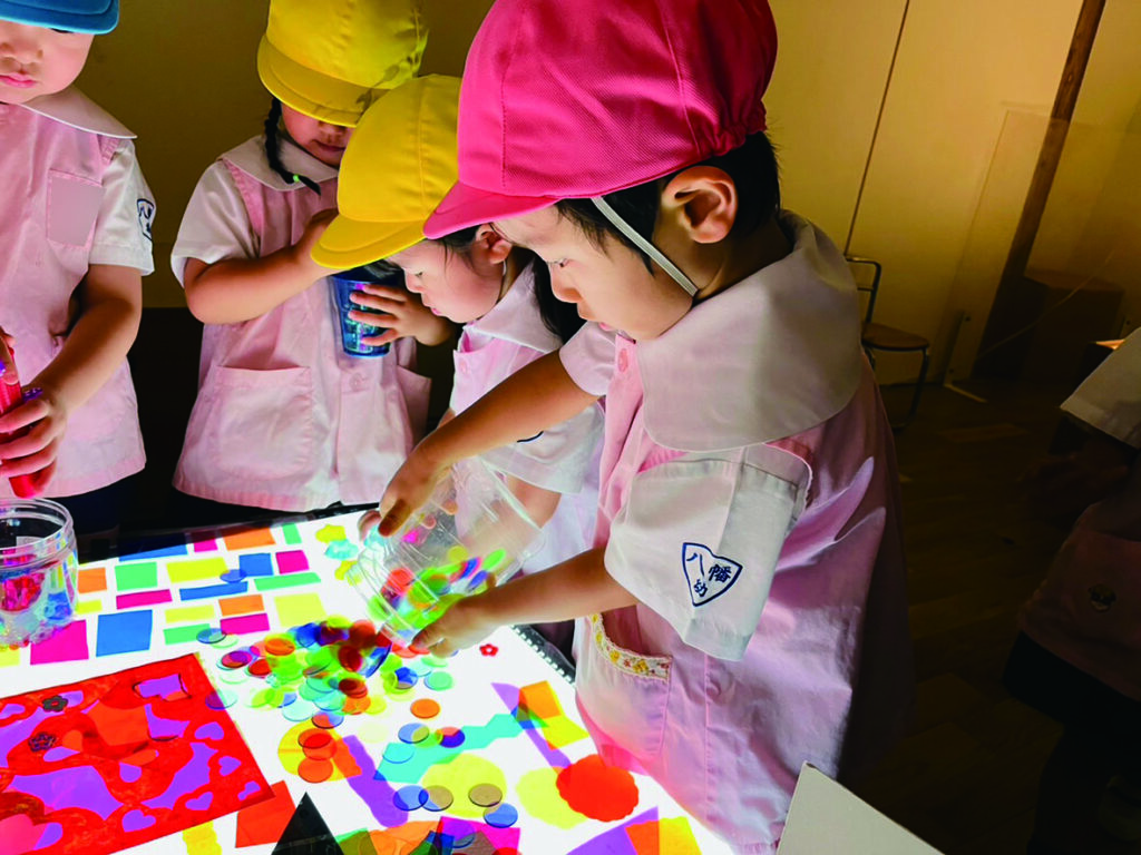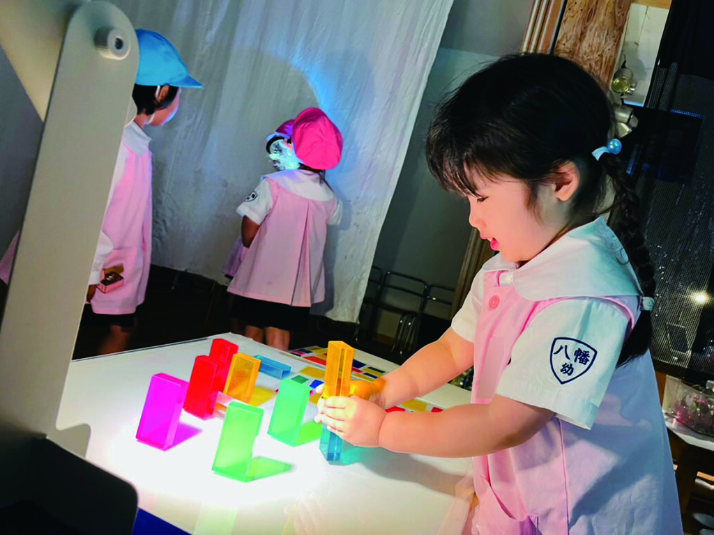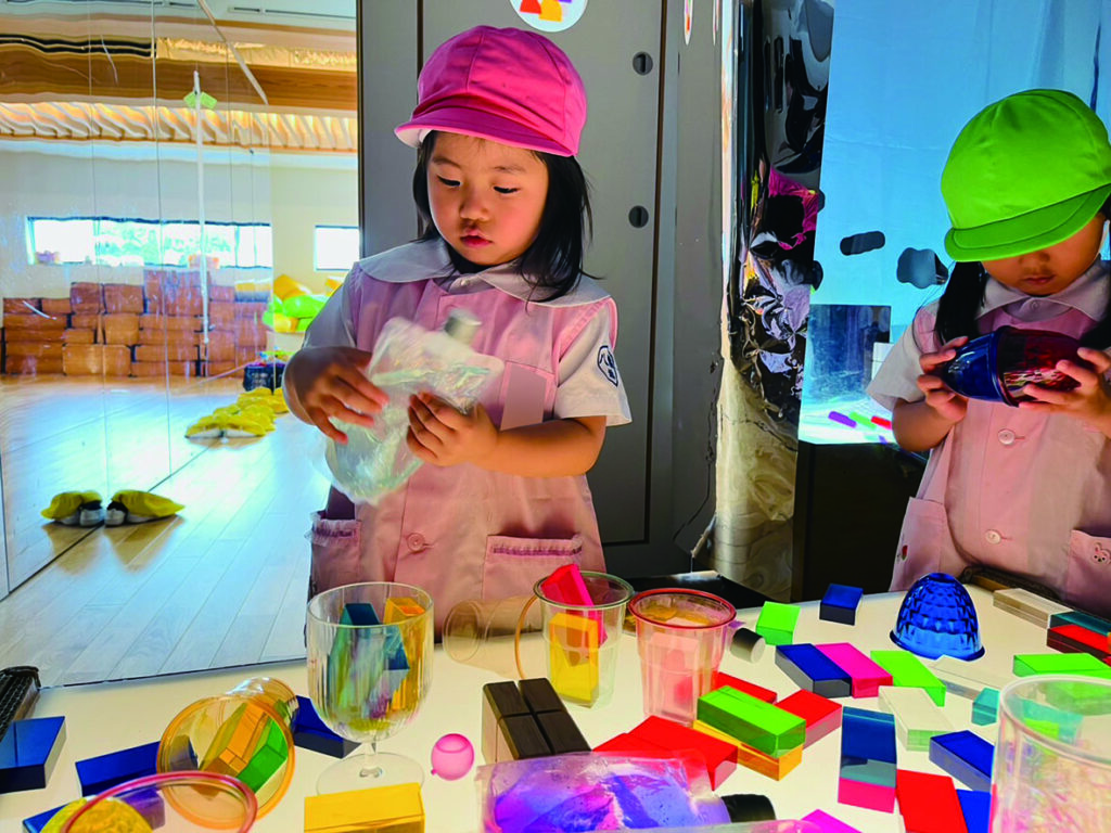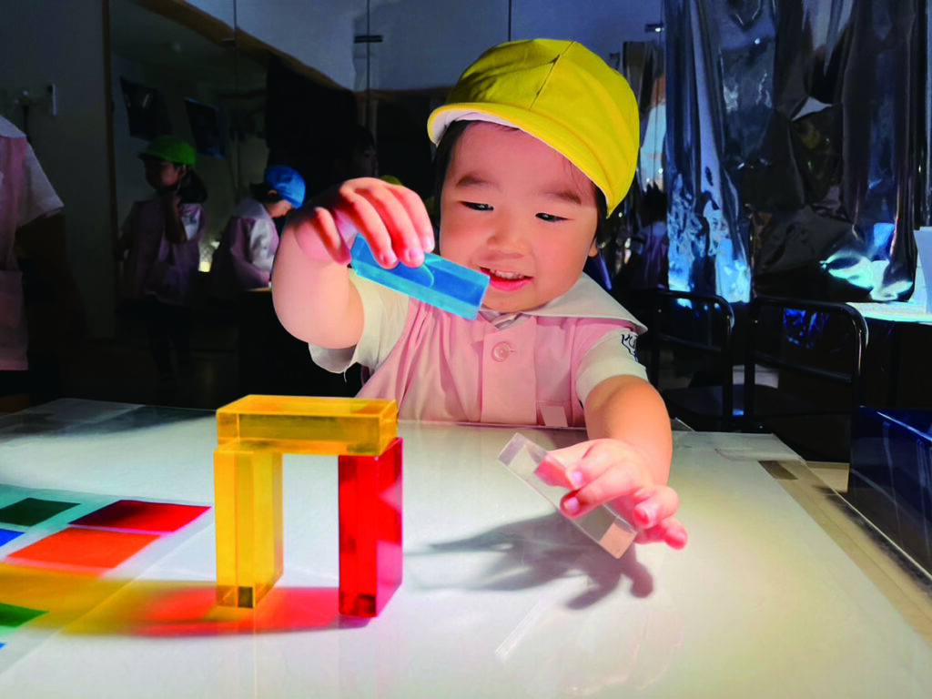 ひかりのへやでのあそびはまだ始まったばかりのひよこ組さん。 キラキラ光るものをいっぱい集めたい! 入れ物いっぱいに集めて運んで、出したり、入れたり、ライトテーブルを埋め尽くします。 目に映るものにとにかく触れて、光の中で色々な輝きに出会います。