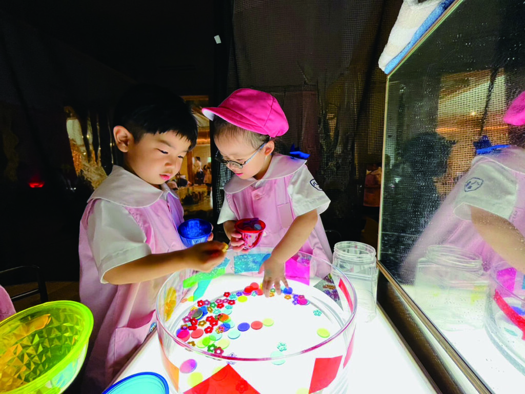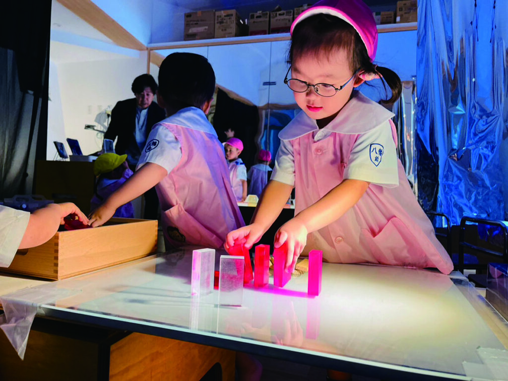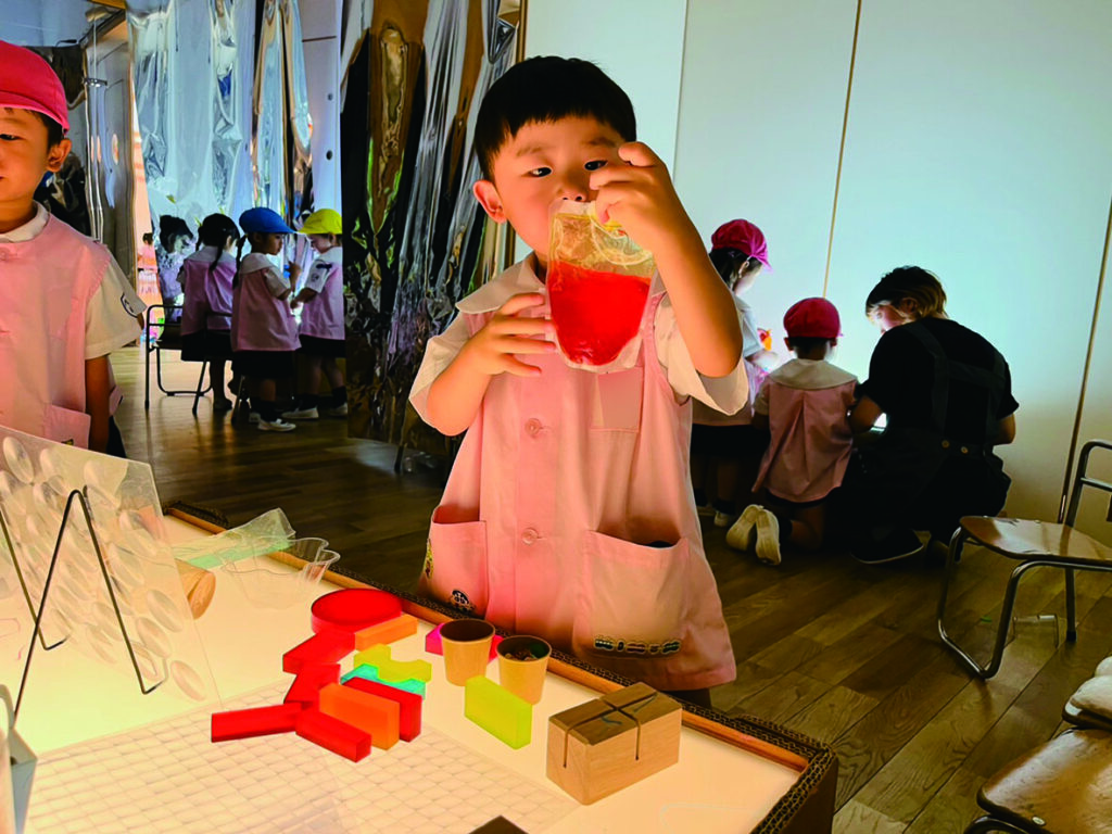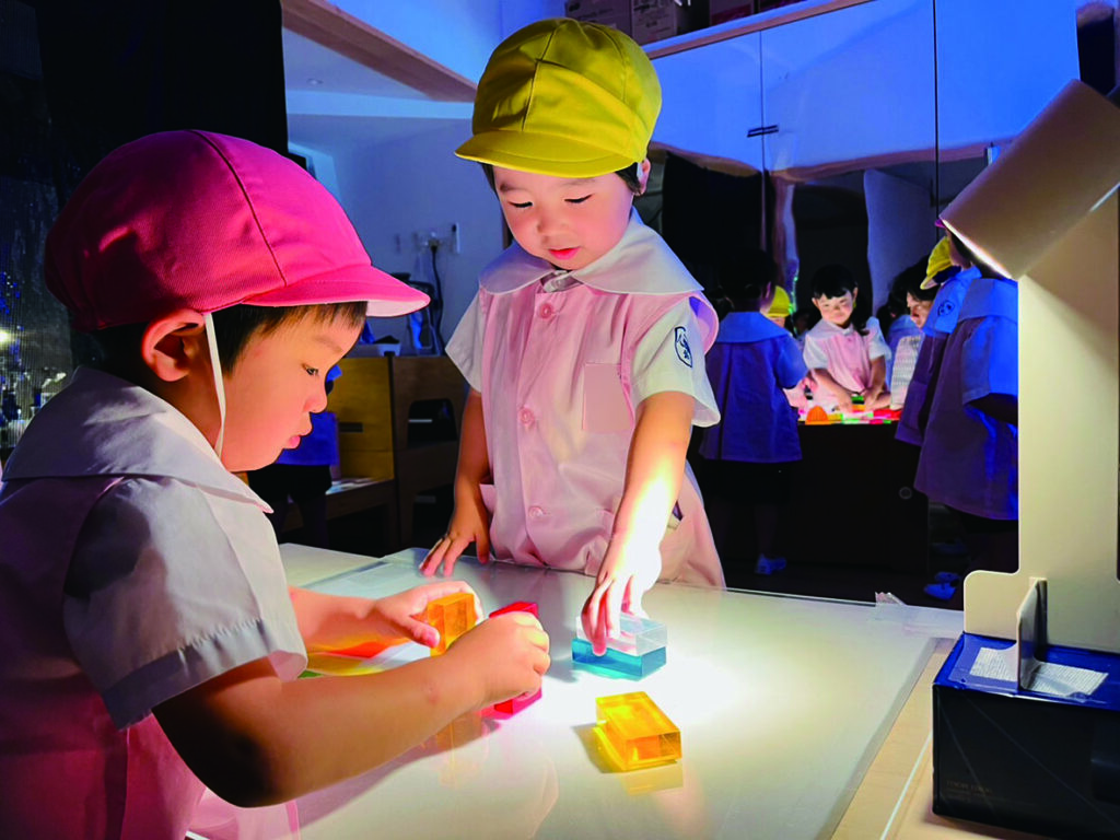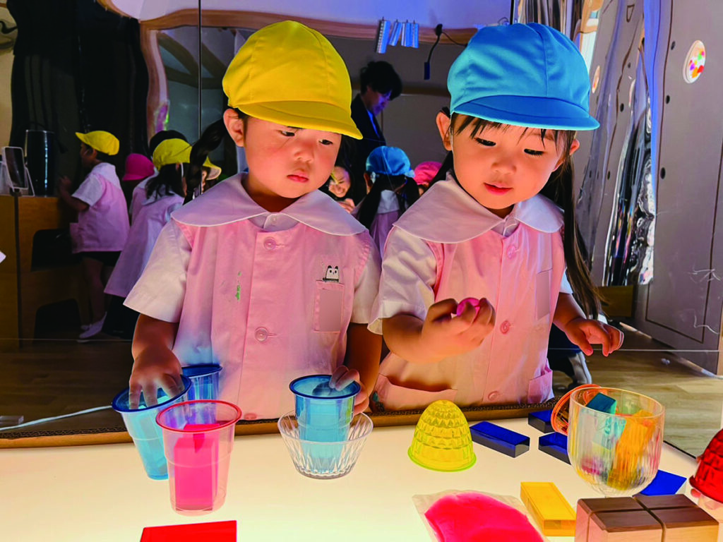 ひかりのへやでのあそびはまだ始まったばかりのひよこ組さん。 キラキラ光るものをいっぱい集めたい! 入れ物いっぱいに集めて運んで、出したり、入れたり、ライトテーブルを埋め尽くします。 目に映るものにとにかく触れて、光の中で色々な輝きに出会います。