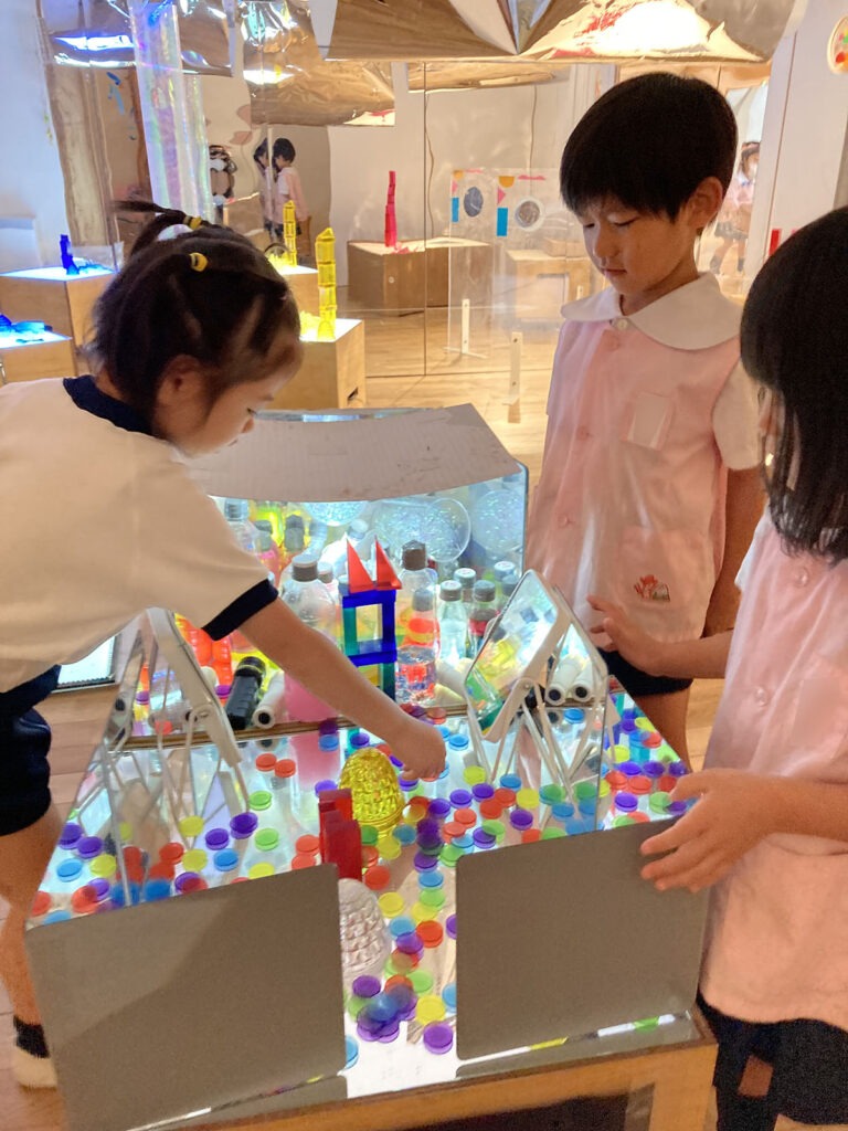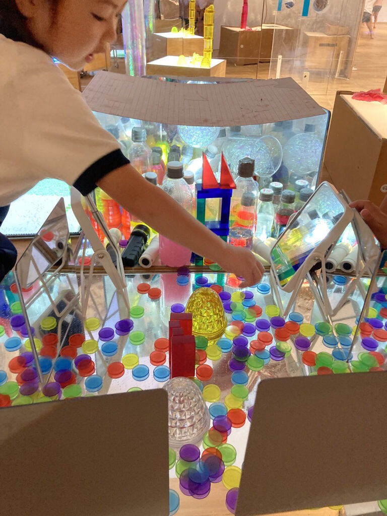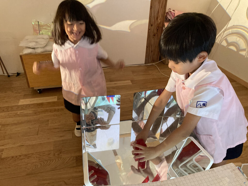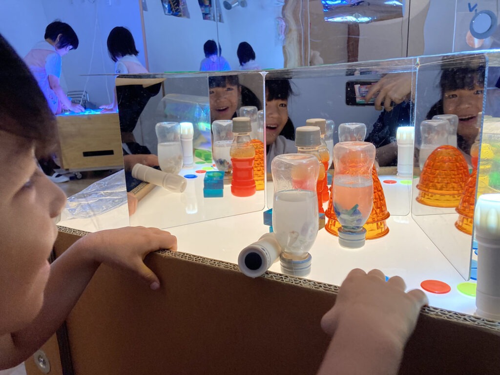 たくさんのおはじきを集め、懐中電灯で照らし、鏡の奥まで広がっていきます。