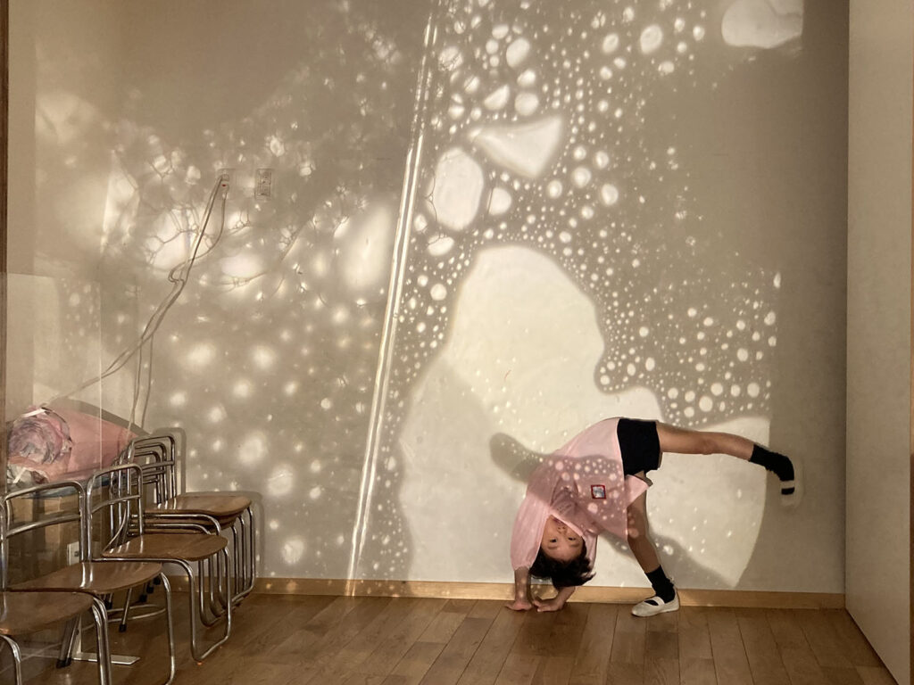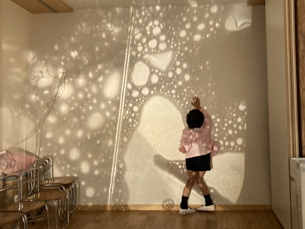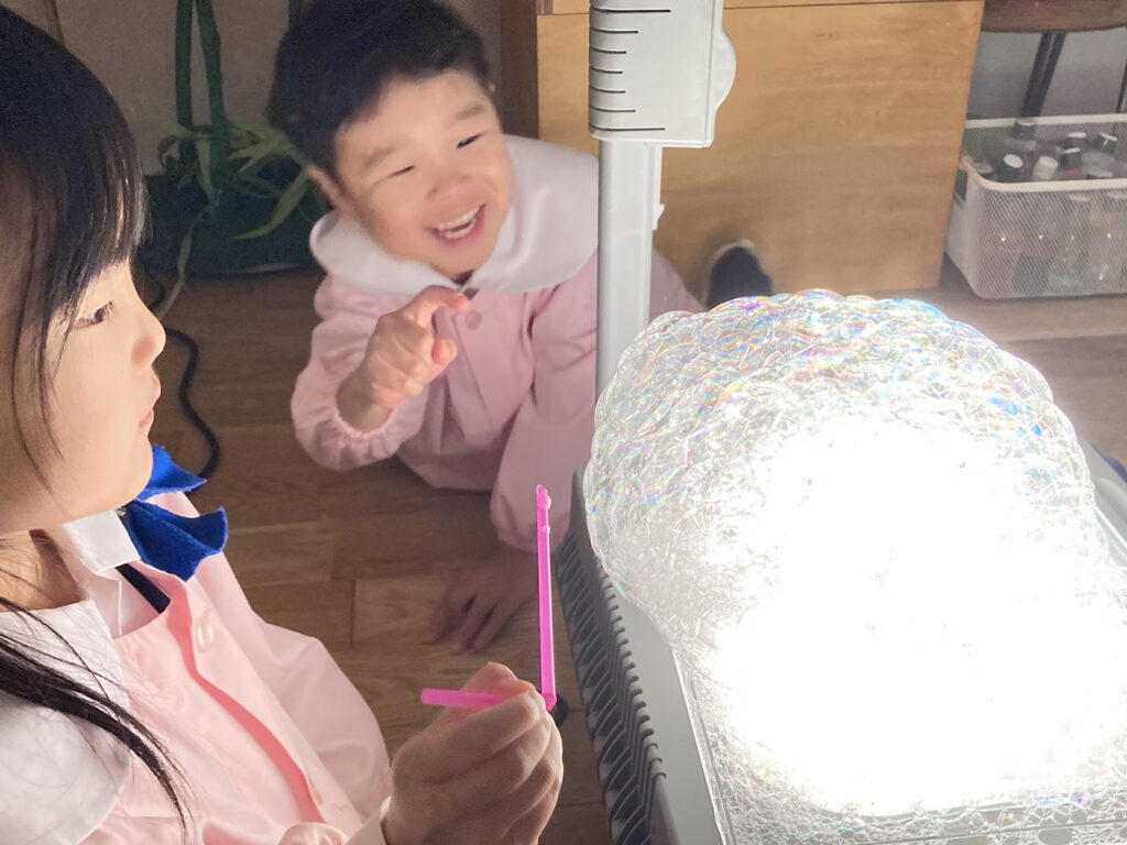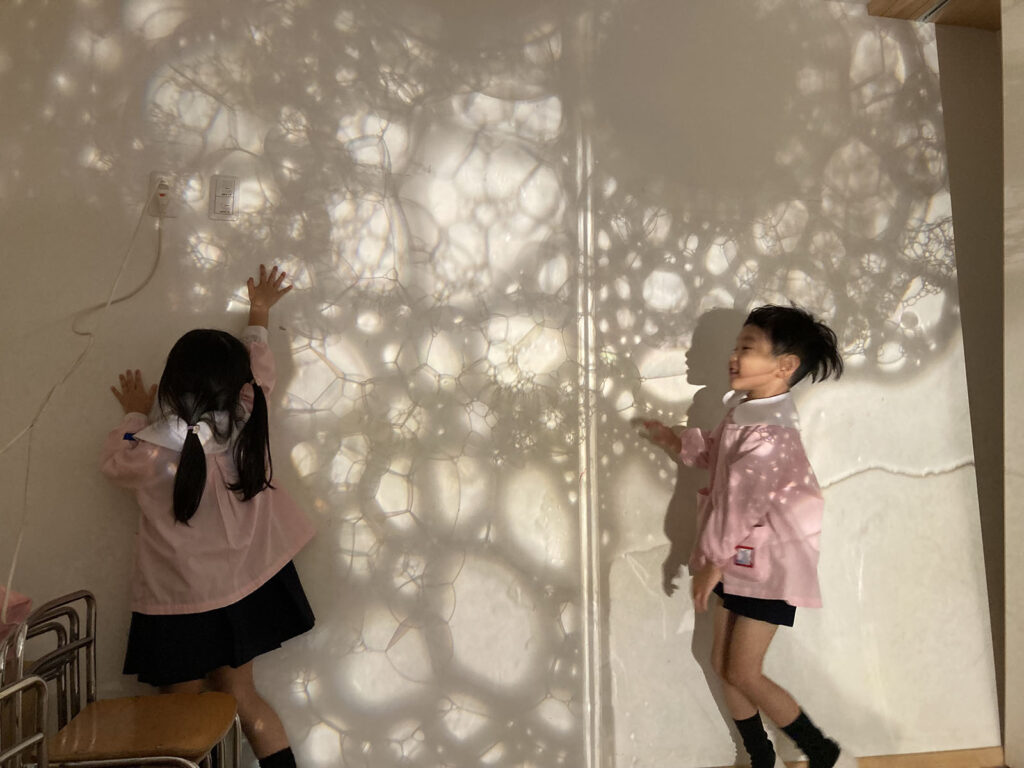 OHPの上できらきら光る泡もきれい、壁に映る泡の世界に入っていくのも面白い。