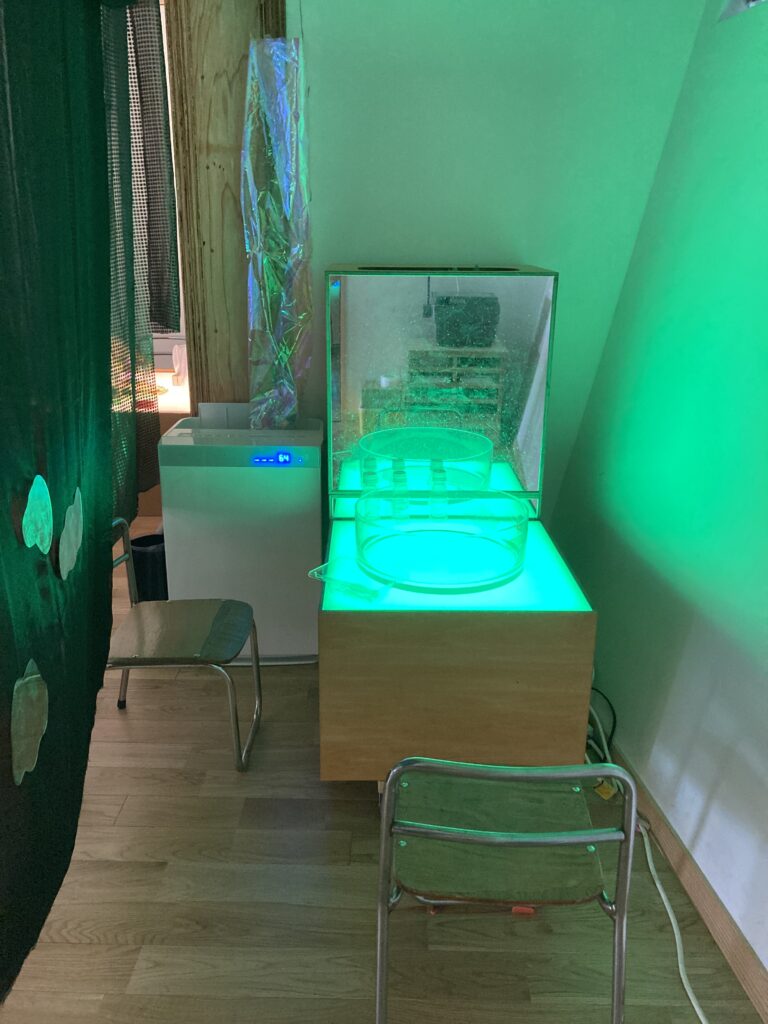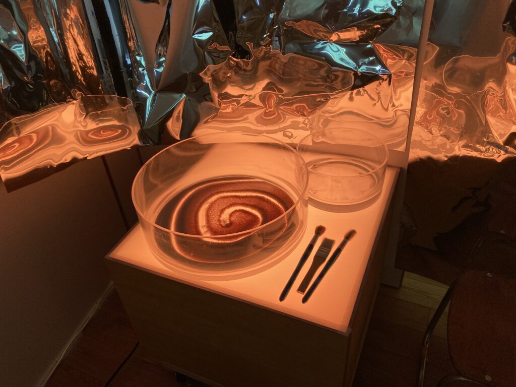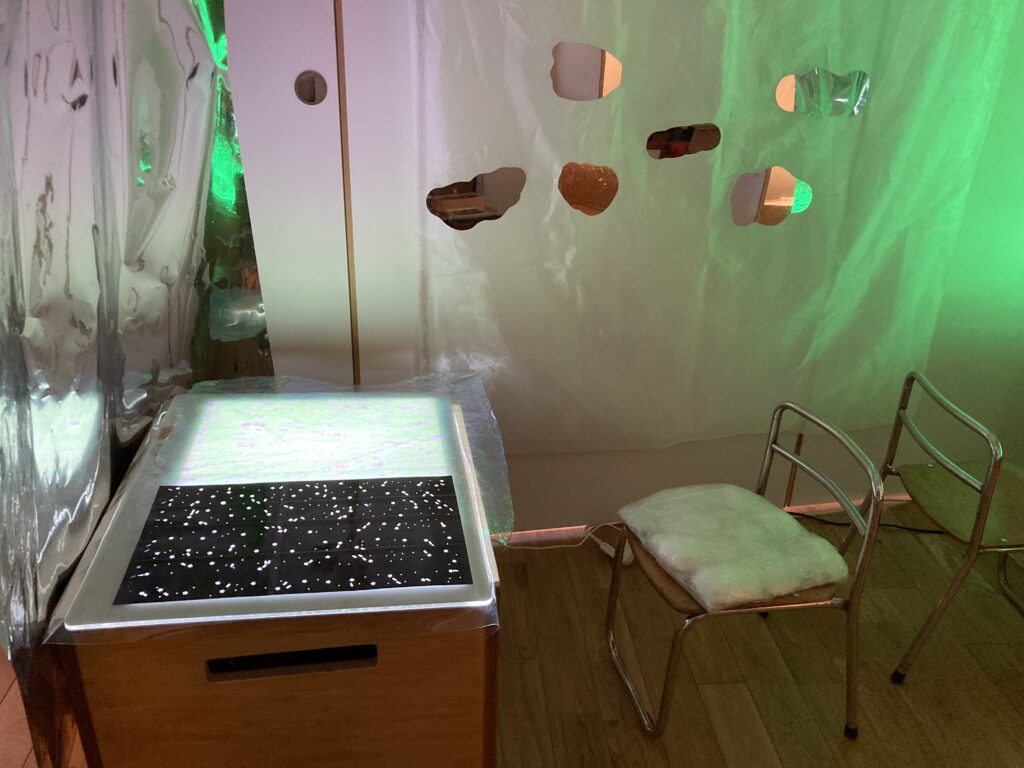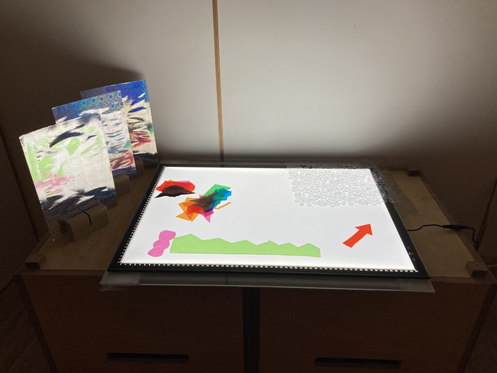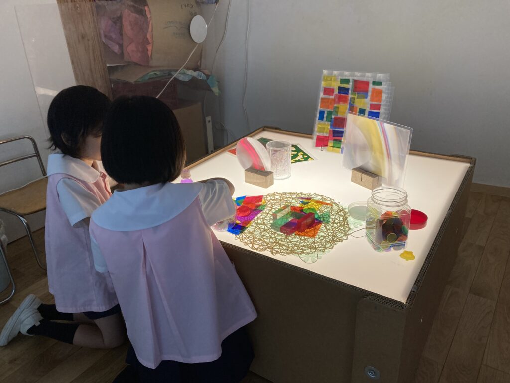 今まで様々な光源(懐中電灯、スタンドライト…)を利用して、光と影のあそびに親しんできた子どもたち。 初期から利用してきた大きなライトテーブル、小さなライトテーブル。 光の部屋の光をライトテーブルだけにして遊んでみます。 今まで触れてきたさまざまな素材を並べて、さてどんなあそびをするでしょうか。