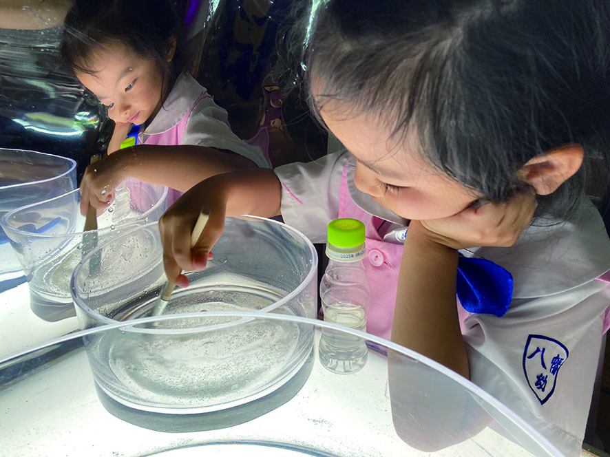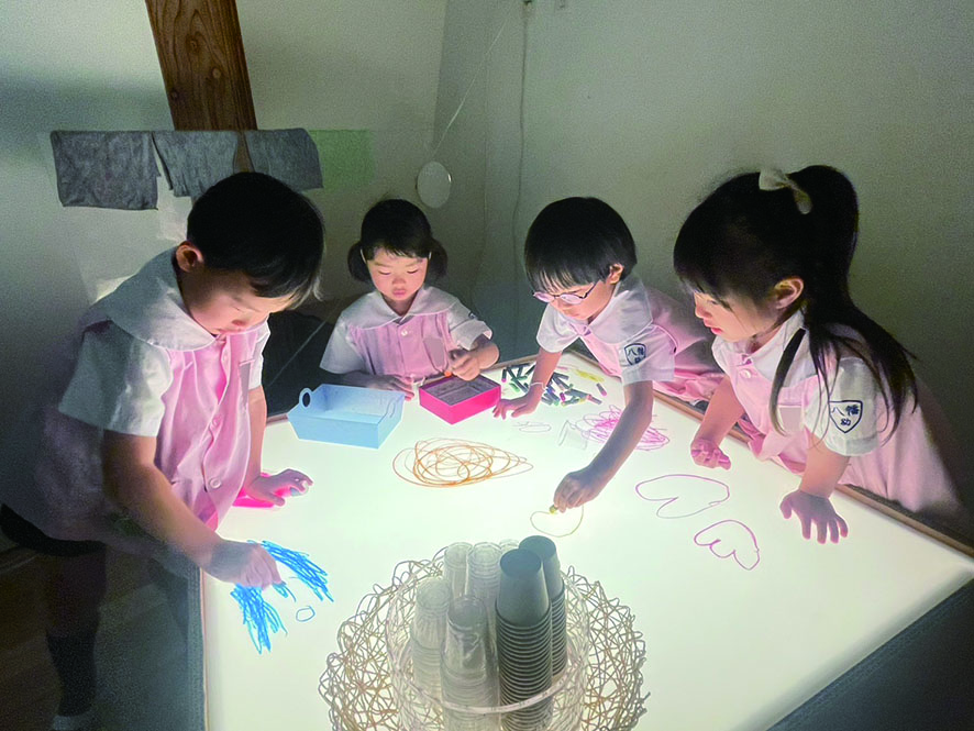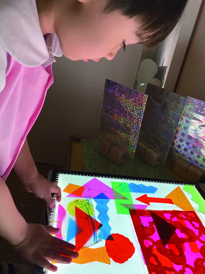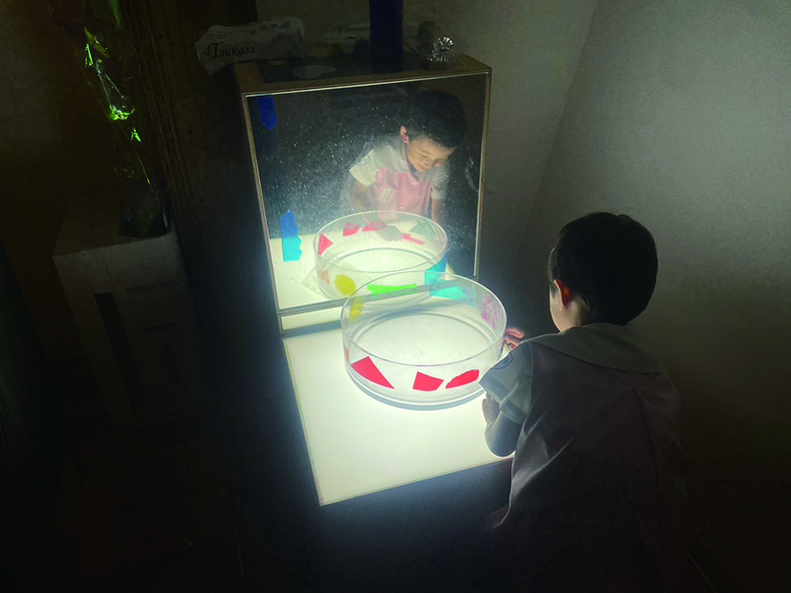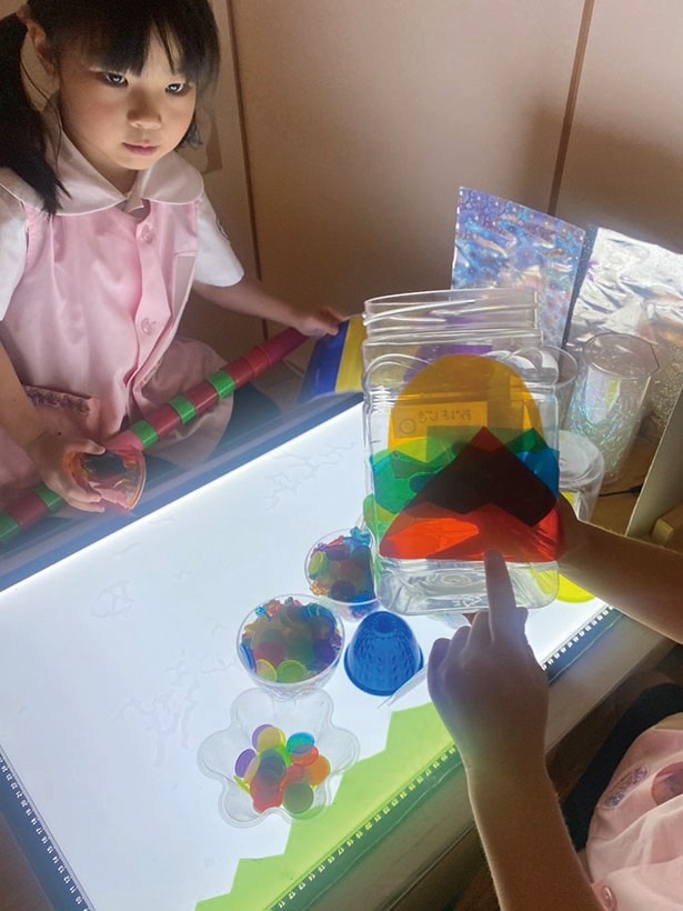 ライトテーブルの柔らかい光は、子どもたちにとって「きれい」で「キラキラ」と魅力的なだけでなく、落ち着く空間を生み出しています。 ライトテーブルだけでも充実したあそびがうまれています。 568110694117933075568112991188025840568113085794222635